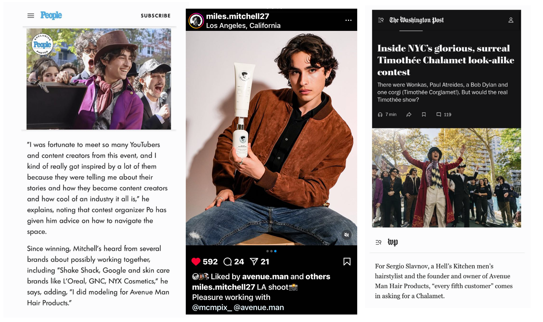 Now, Zander and first-place winner Miles Mitchell are gearing up for an Oscars trip sponsored by Avenue Man Hair Products, where they’ll be Oscar-week ready, whether on stage or behind the scenes. With press coverage from The Washington Post, People Magazine, and Newsweek, their journey as Chalamet’s top look-alikes is only beginning.