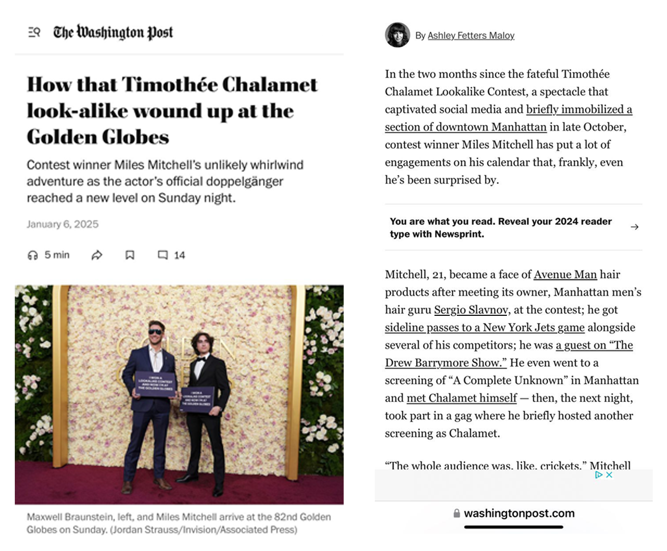 Miles Mitchell Shines at the 2025 Golden Globes After Winning Timothée Chalamet Look-Alike Contest