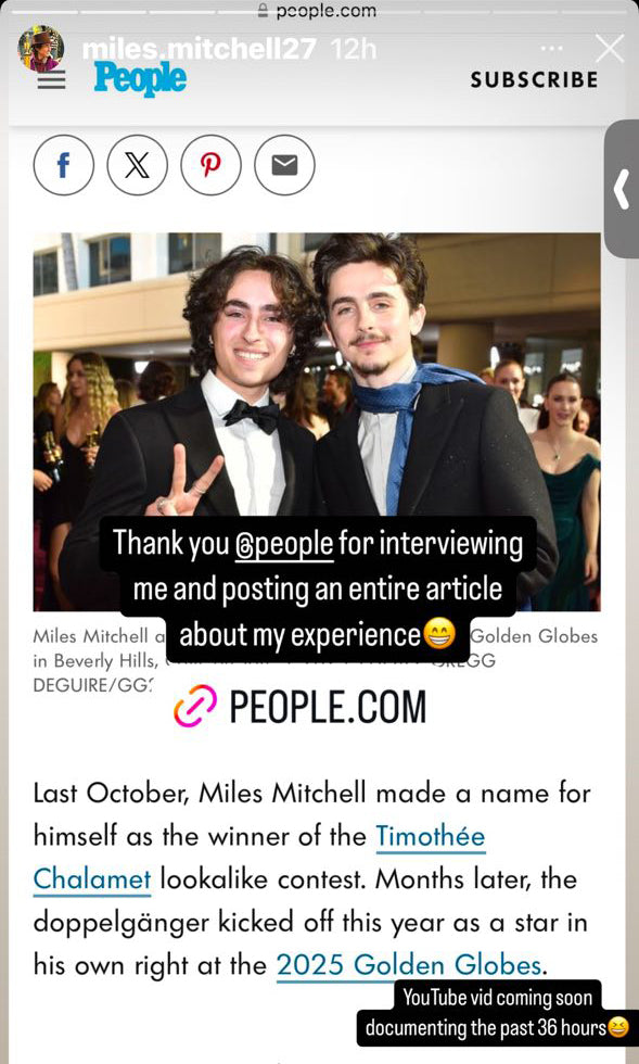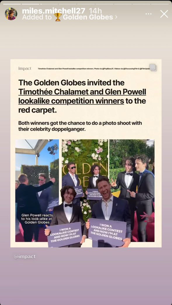 Miles Mitchell Shines at the 2025 Golden Globes After Winning Timothée Chalamet Look-Alike Contest