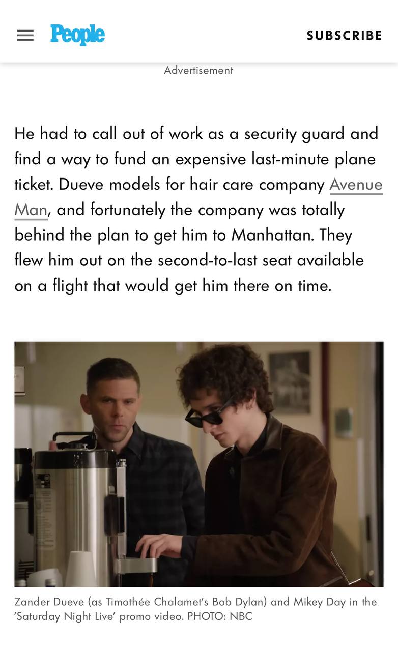 Zander recently brought his talents to the spotlight with an unforgettable performance in an SNL promo, where he portrayed a Bob Dylan-inspired version of Timothée Chalamet. The skit gained widespread attention for its humor and Zander's ability to channel both Dylan’s iconic persona and Chalamet’s signature style. This milestone marks Zander's first major on-screen debut, made possible by the unwavering support of the Avenue Man team, who ensured he looked picture-perfect for the camera.
